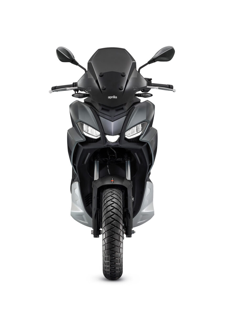 A nivel de diseño destaca en el frontal esa inspiración con sus hermanas mayores como podrías ser la Tuono o las RSV, con un marcado carácter deportivo. Para resaltar su diseño de scooter crossover la marca de Noale ha reducido la sección del carenado frontal, dejando bien a la vista la horquilla.