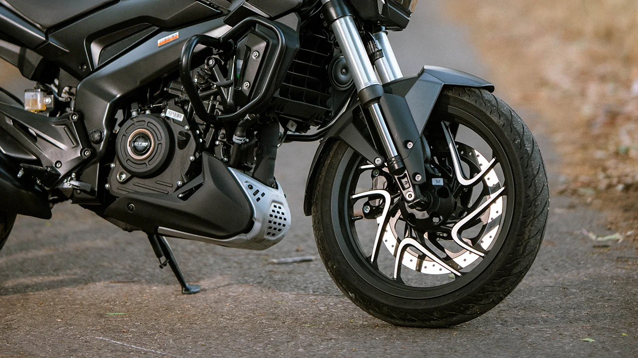 Con 193 kg en orden de marcha, la Dominar 400 se sitúa en ese punto dulce entre estabilidad a ritmo de crucero y maniobrabilidad en ciudad. La horquilla invertida (USD) aporta precisión en el tren delantero y transmite confianza al enlazar curvas o sortear baches urbanos. En el apartado de frenos, monta disco delantero de 320 mm con pinza ByBre, un conjunto pensado para dosificar bien la frenada y detener con seguridad en cualquier escenario cotidiano. El resultado es una moto dócil y divertida, que no abruma al piloto novel pero tampoco se queda corta cuando el camino se abre y apetece estirar un poco más.
