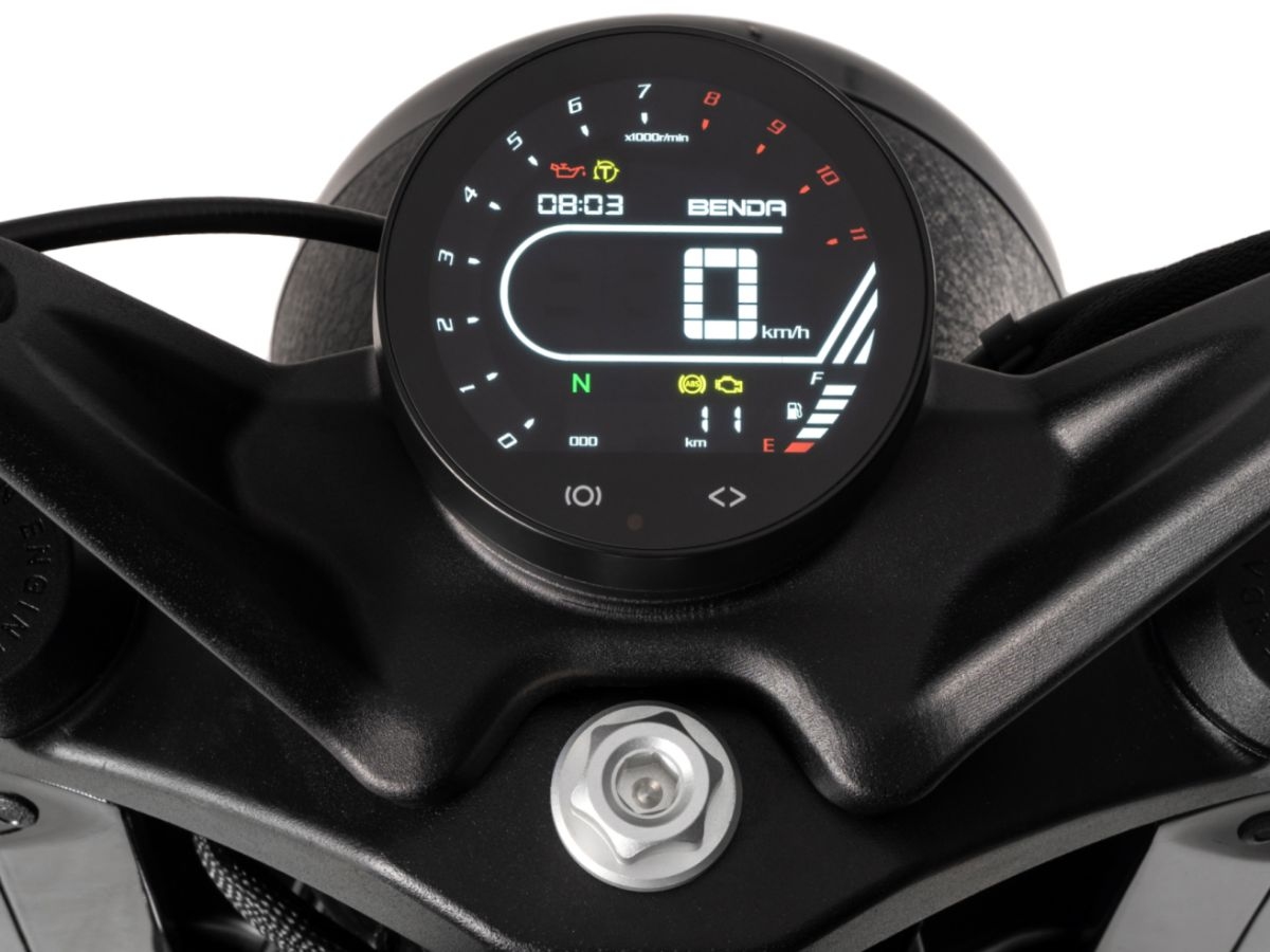 La tecnología también juega un papel crucial en esta moto custom de Benda. Uno de sus componentes más avanzados es su salpicadero TFT en color, que ofrece una interfaz de usuario clara y minimalista. Este display proporciona información en tiempo real sobre la moto, como la velocidad, el consumo de combustible y otros datos esenciales, de una manera fácil de interpretar.