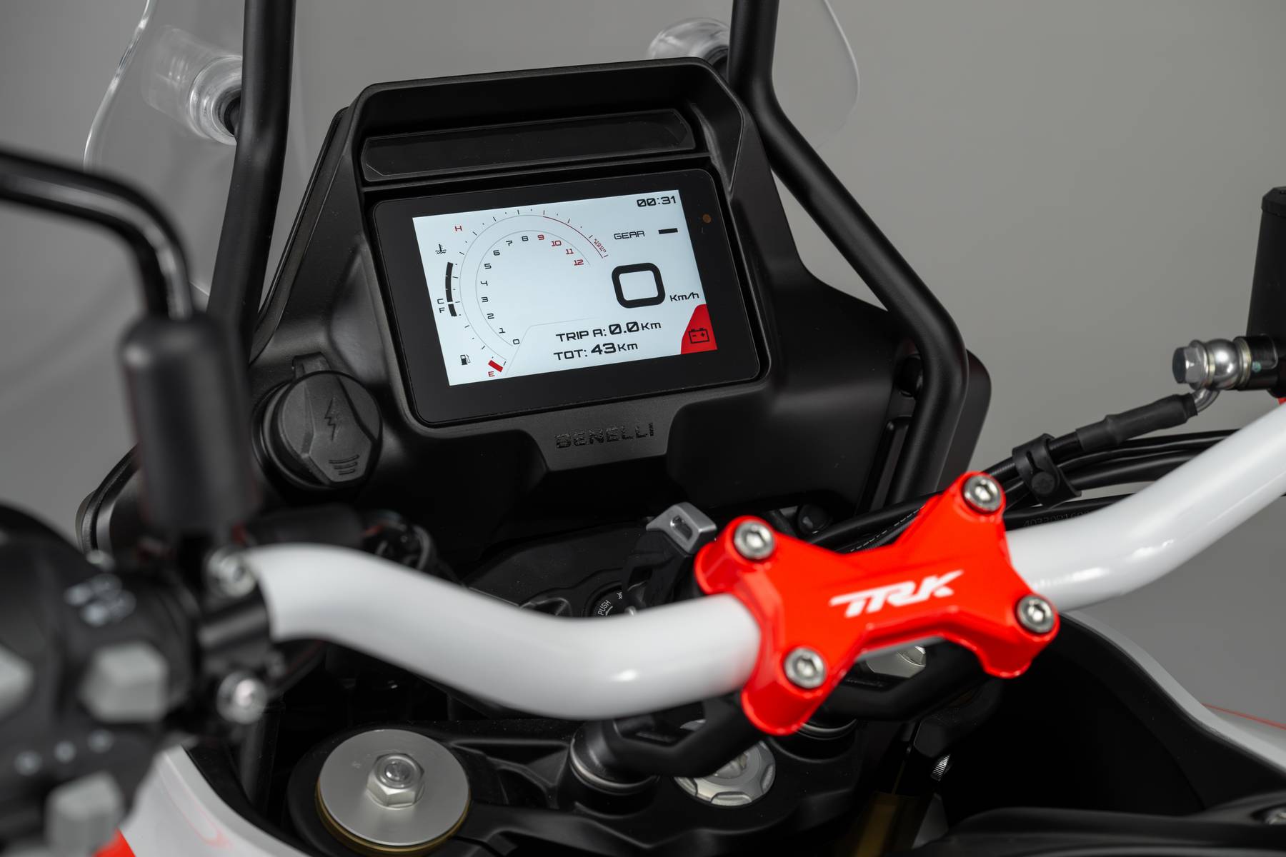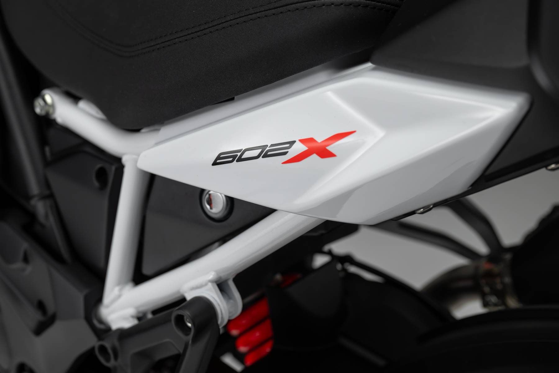 El trabajo conjunto del I+D y el Centro Stile de Pésaro se nota a primera vista. La 602 X hereda el lenguaje de las 702/902, pero lo simplifica: superficies más fluidas, sin cortes bruscos, con una tapa de depósito que se prolonga hacia el pico delantero y los paneles del radiador. Los laterales más estrechos bajo el asiento se integran con el subchasis y culminan en una zona posterior visualmente ligera. Resultado: una silueta aún más reconocible dentro de la familia TRK. La altura de asiento de 825 mm promete un equilibrio interesante entre control en parado y confort en ruta.