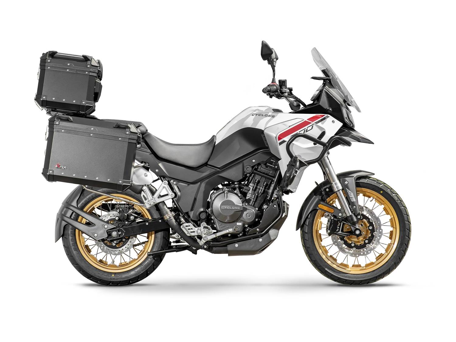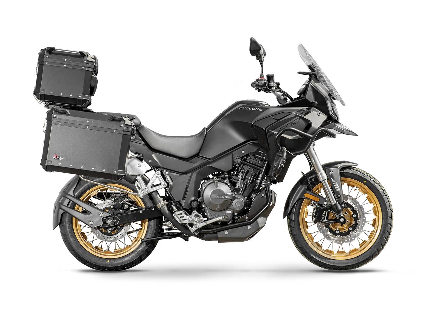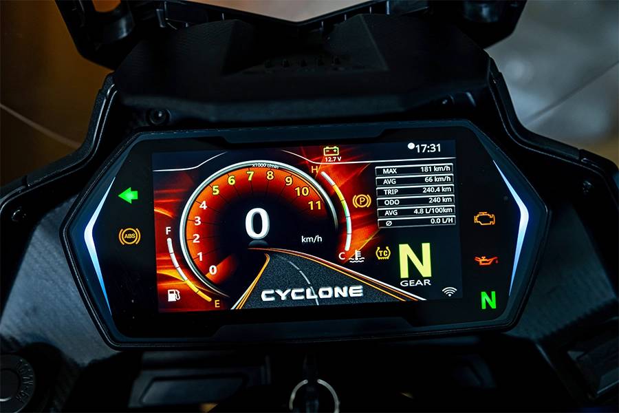La ergonomía de esta moto Cyclone es claramente viajera: manillar de aluminio ancho para mayor palanca, asiento pensado para “kilometrar” y piñas retroiluminadas que facilitan su uso en rutas nocturnas. La posición neutra y el tarado de suspensiones regulables ayudan a personalizar la moto a tu peso y estilo; quien rote entre ciudad, autovía y caminos agradecerá esa versatilidad. Además, con los neumáticos tubeless y el sensor de presión, la gestión de pinchazos y el control del estado de las gomas se simplifican, algo clave cuando viajas cargado.