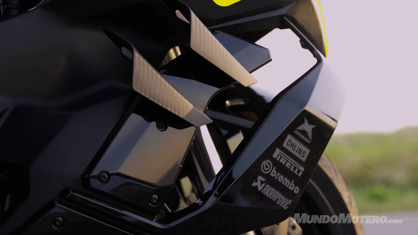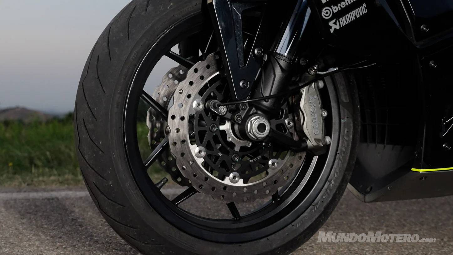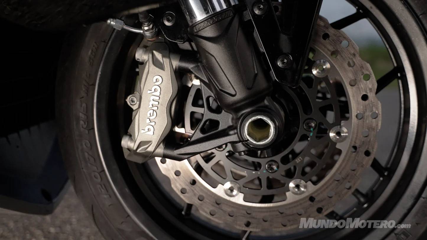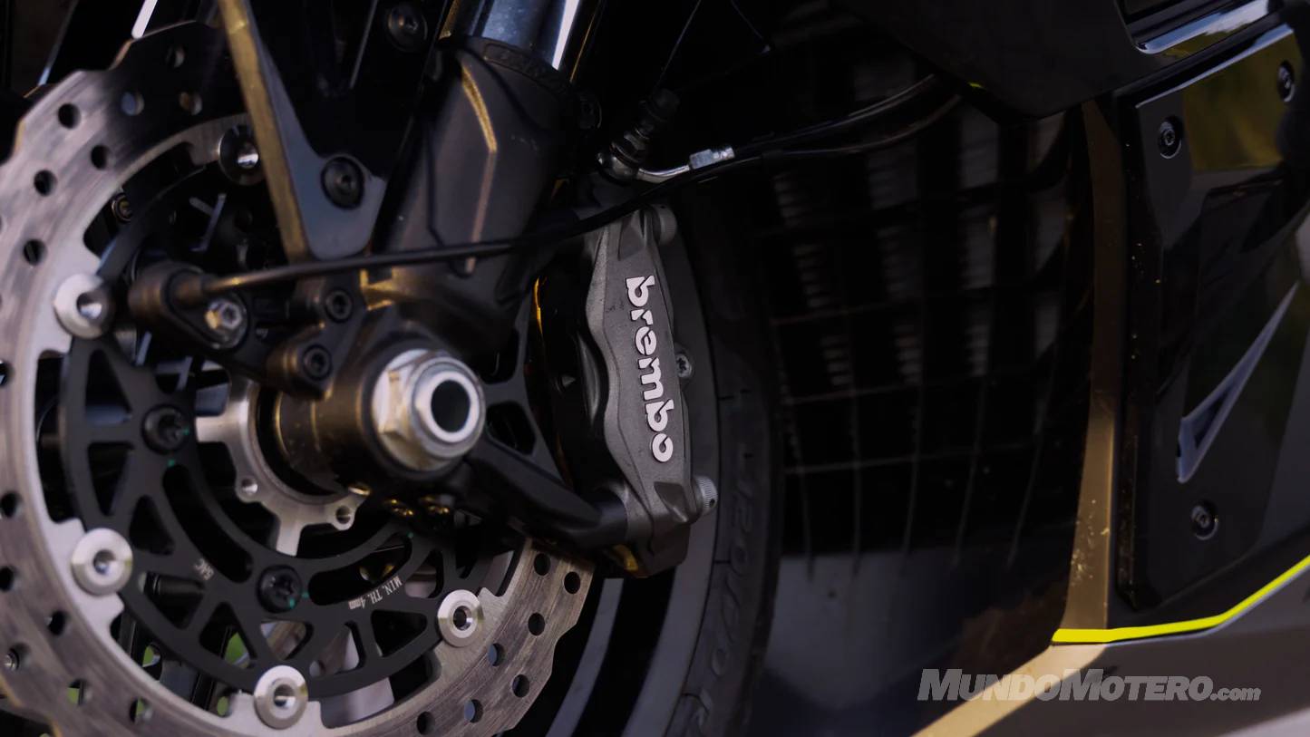 - Frenos: Si vas rápido, necesitas parar bien, y para eso están las pinzas Brembo mordiendo el doble disco delantero.