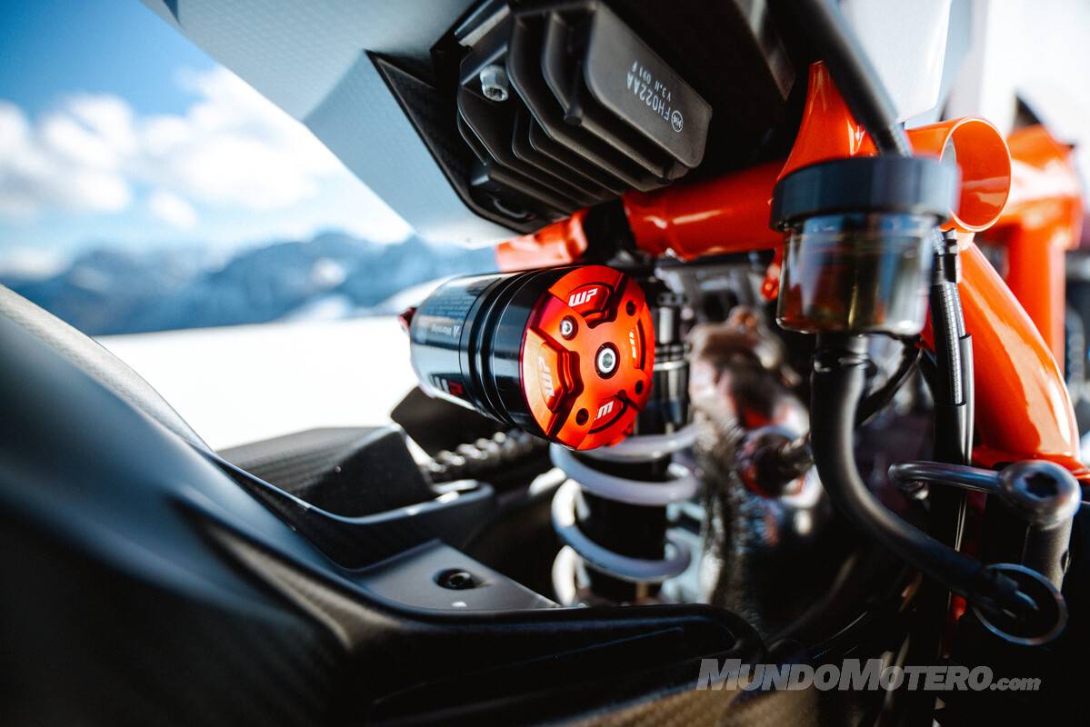 El trabajo en este apartado se apoya en unas suspensiones WP PRO COMPONENTS, descritas como derivadas de MotoGP y con amplias posibilidades de ajuste. Más allá del reclamo técnico, lo importante aquí es el enfoque: hablamos de un equipo pensado para pilotos exigentes, capaz de adaptarse con mayor precisión a distintos estilos, ritmos y condiciones de uso. Es una moto que no solo quiere ser rápida, sino también exacta y configurable.