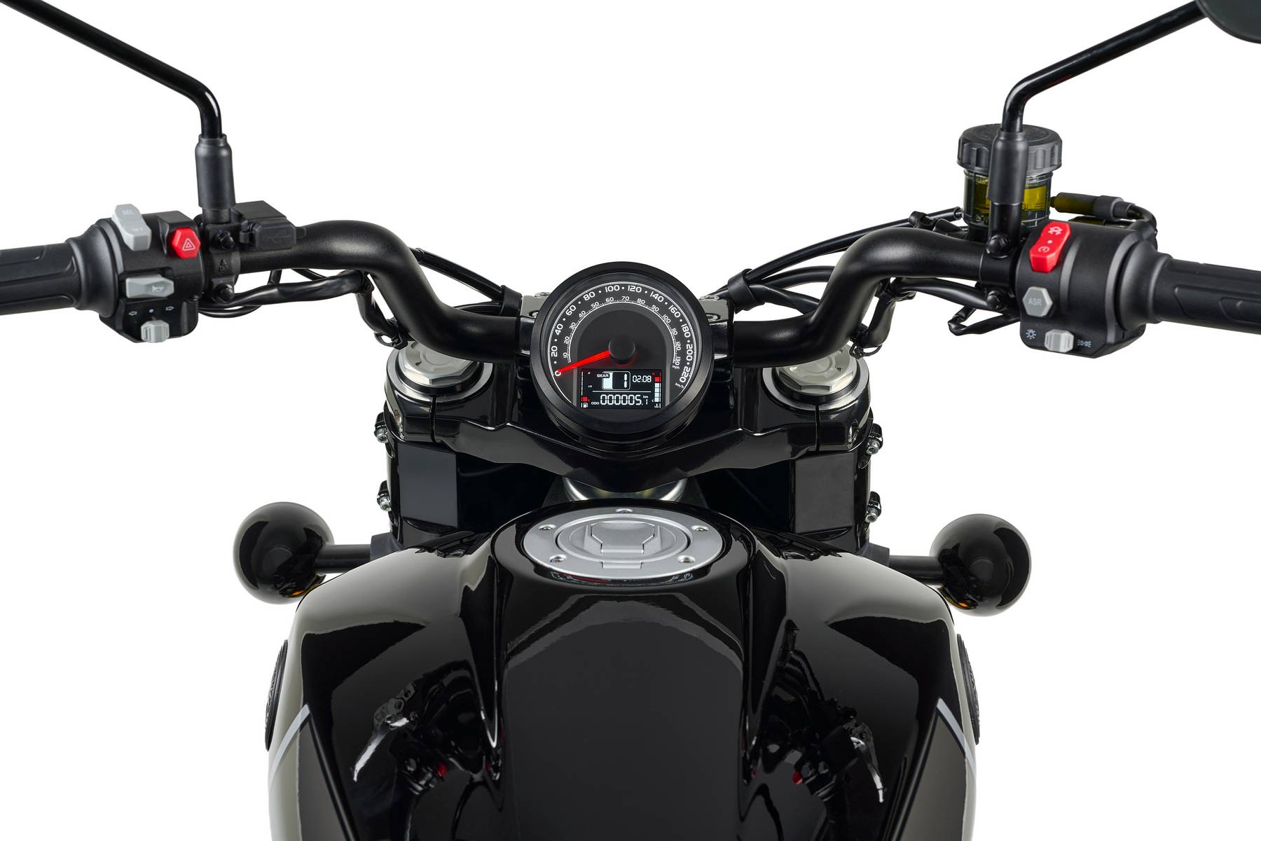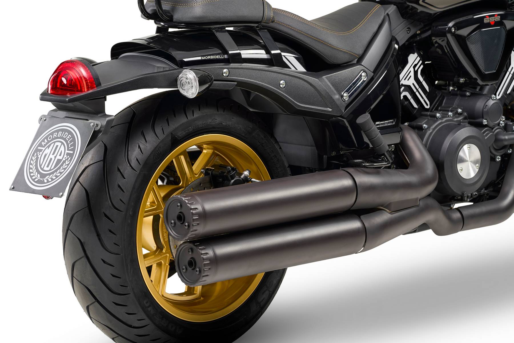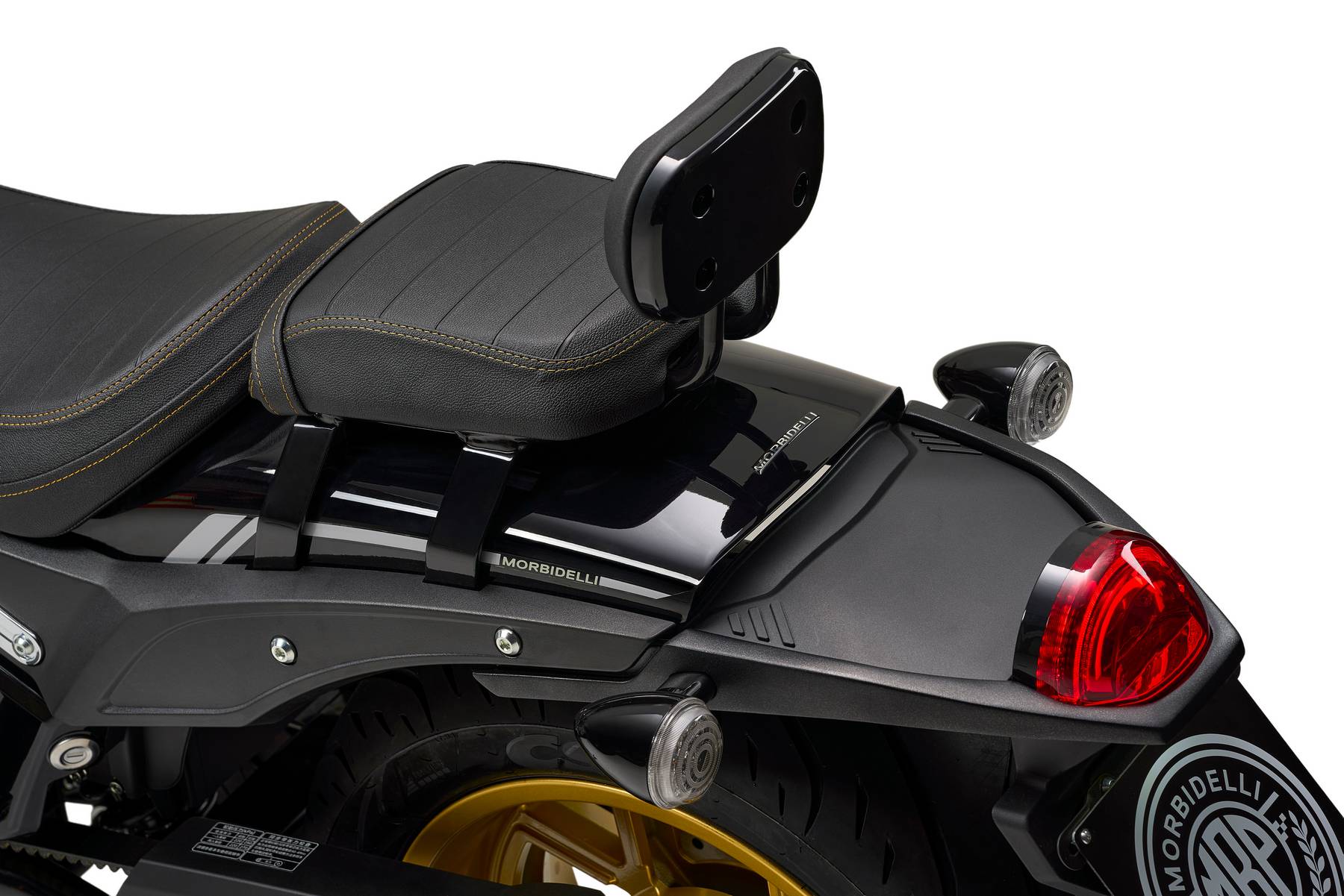 Morbidelli ha cuidado la interacción con el piloto con un cuadro singular: tacómetro analógico de barrido que integra una pantalla digital central, una solución que mezcla tradición y lectura clara de la información relevante. La iluminación es full LED y se añade toma USB-A para dispositivos. El depósito de 18,5 litros amplía la autonomía, mientras que el asiento de pasajero desmontable permite pasar del formato biplaza a una estética “bobber” en segundos, reforzando la versatilidad estética y funcional del modelo. Son decisiones de producto orientadas al día a día, sin perder de vista el guiño al custom clásico.