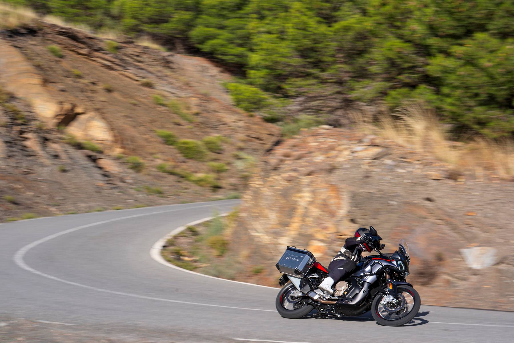 En el corazón, el tres cilindros de 931 cc desarrollado y fabricado en Varese. Pesa solo 57 kg y mantiene la cigüeñal contrarrotante, un sello técnico de MV que reduce la inercia giroscópica y agiliza los cambios de dirección. La cifra de potencia es clara: 124 CV a 10.000 rpm y 102 Nm a 7.000 rpm, pero lo importante en una moto maxitrail es como los entrega. Aquí destaca que el 85% del par está disponible desde 3.500 rpm, lo que facilita adelantamientos, subidas con carga y conducción off-road sin tener que estirar marchas.