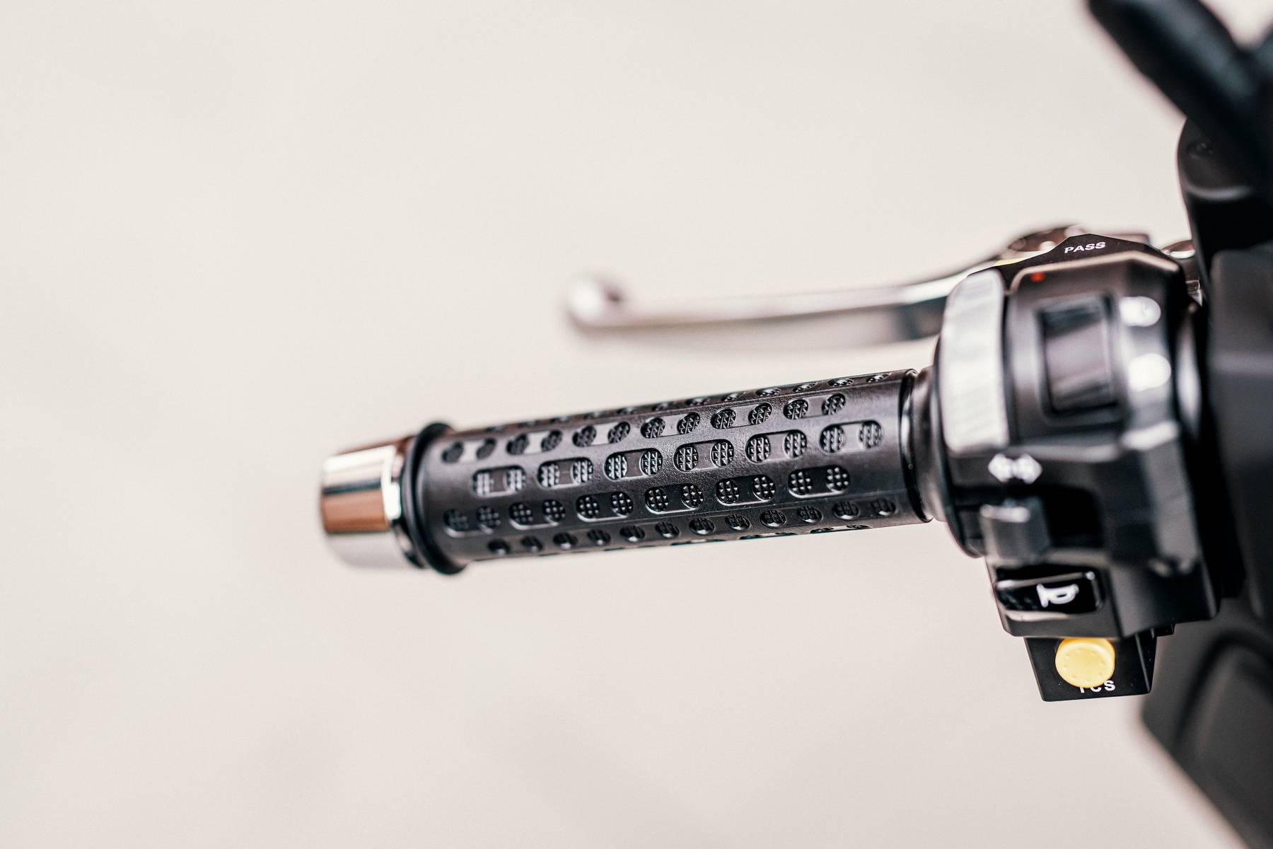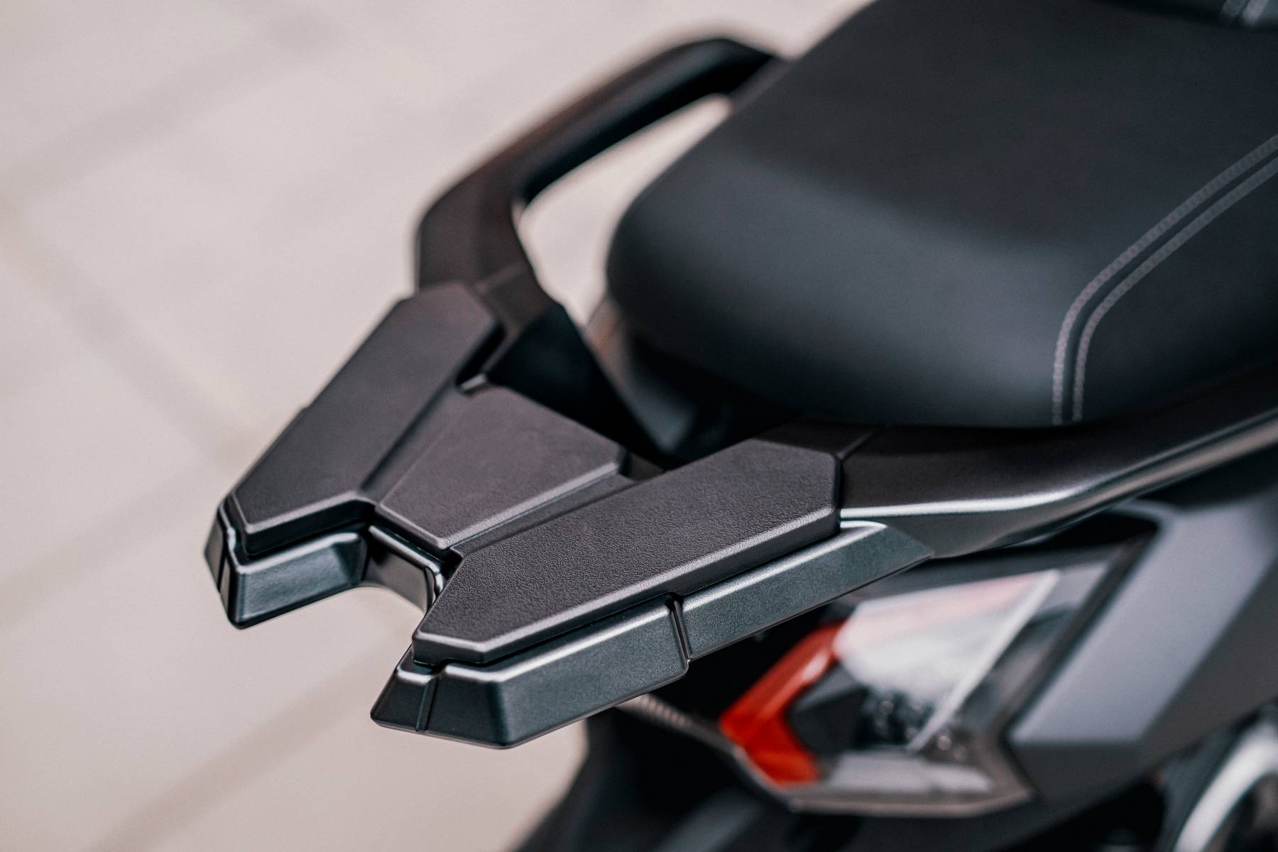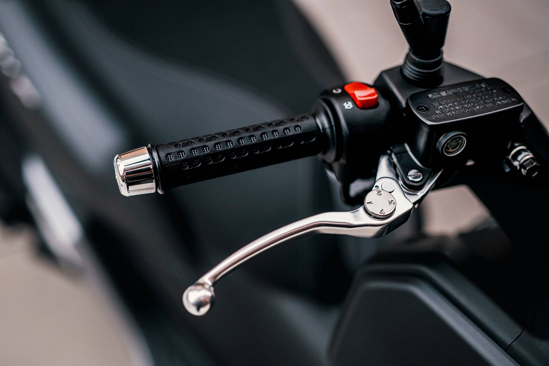 La configuración del chasis y suspensiones de este scooter de 400 cc está orientada a filtrar baches y mantener la estabilidad cuando toca sumar kilómetros. Atrás, el doble amortiguador es ajustable en cinco niveles de precarga, una solución práctica para adaptar el comportamiento según carga o pasajero. Las manetas de freno regulables en cuatro posiciones ayudan a encontrar el punto perfecto de alcance para cada usuario, mientras que el freno de estacionamiento añade un plus de seguridad en pendientes o aparcamientos.