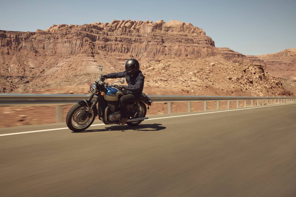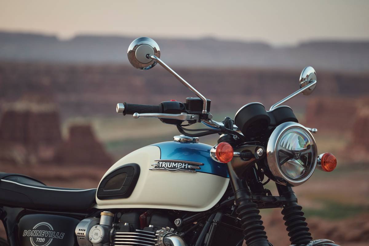 La gran evolución técnica llega con el ABS y el control de tracción optimizados para curvas, gestionados por una IMU que monitoriza en tiempo real el ángulo de inclinación y el movimiento de la moto para modular la asistencia cuando es preciso. La T120 ofrece dos modos de conducción, Road y Rain, que adaptan la respuesta del acelerador y la intervención del control de tracción a las condiciones del asfalto.