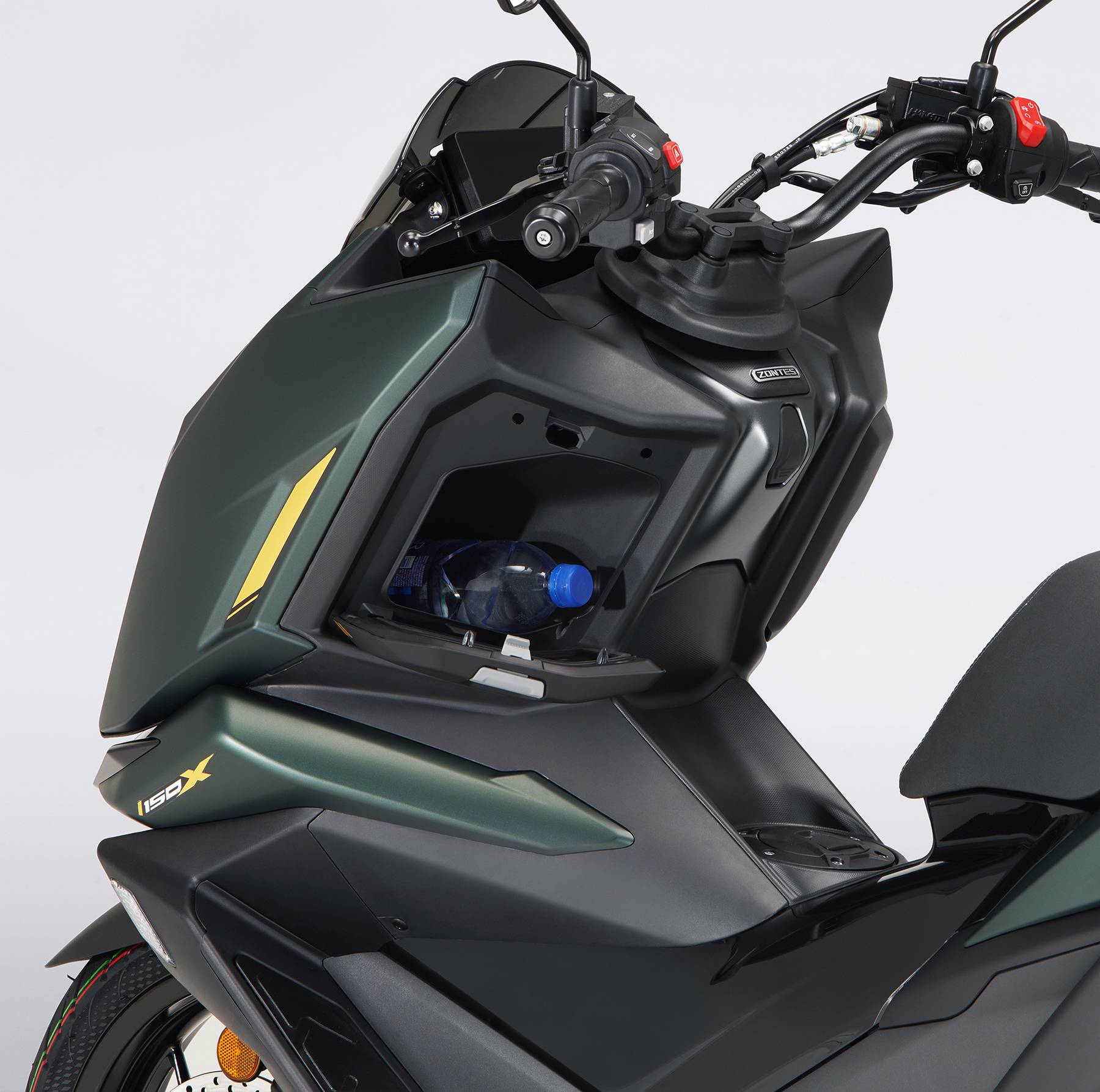 La sorpresa llega al abrir el asiento: un hueco iluminado capaz de alojar dos cascos integrales, algo muy poco común incluso en scooters de mayor tamaño. A ello se suman dos guanteras frontales —una con doble toma USB (A y C) de alta potencia—, gancho portabolsas, freno de estacionamiento, conmutadores retroiluminados y asas traseras preparadas para baúl. ZONTES incluye dos parabrisas de serie (diseños y alturas distintos) para adaptar la protección al uso urbano o interurbano sin pasar por caja. La iluminación Full LED desarrollada con Osram y el DRL en forma de X refuerzan una identidad visual moderna y fácilmente reconocible.