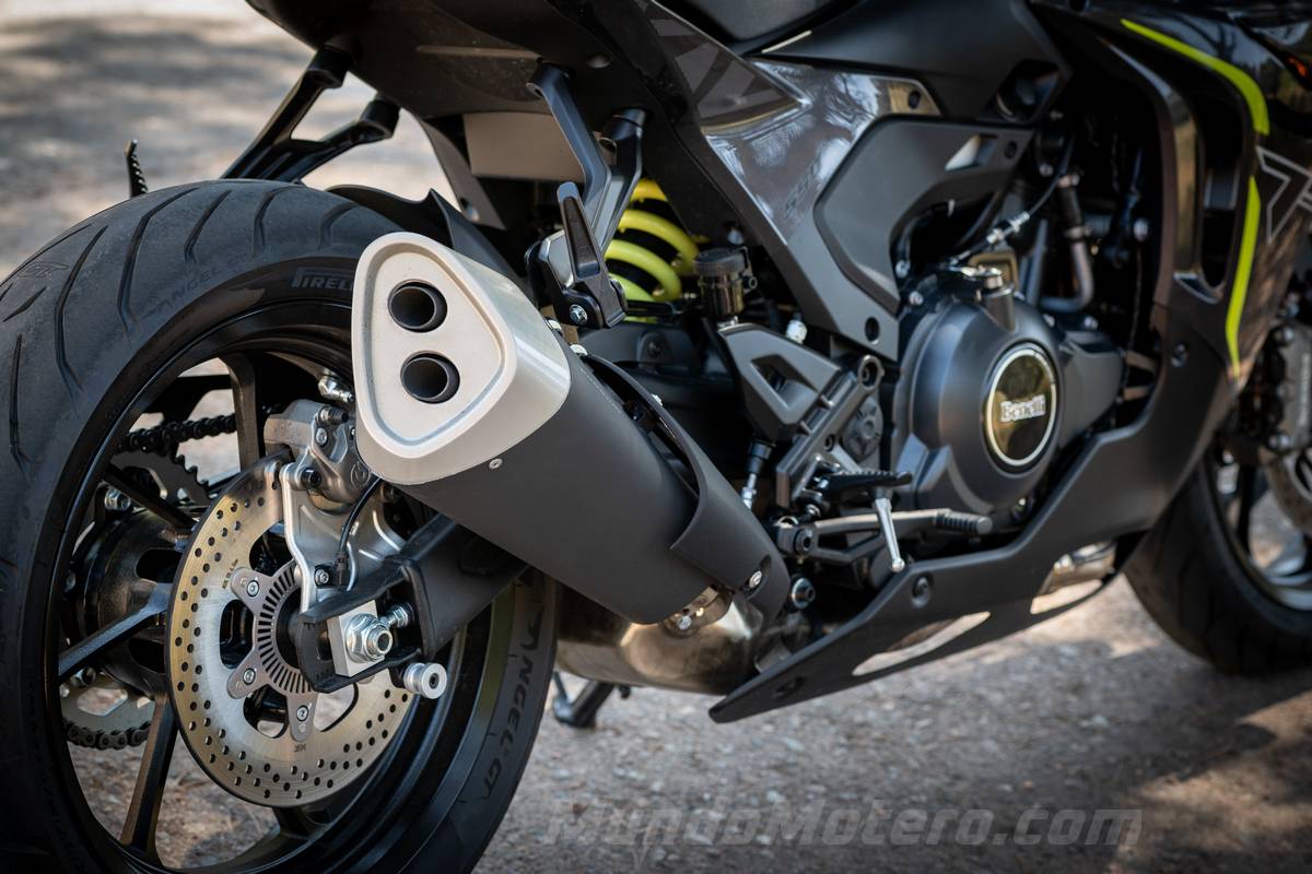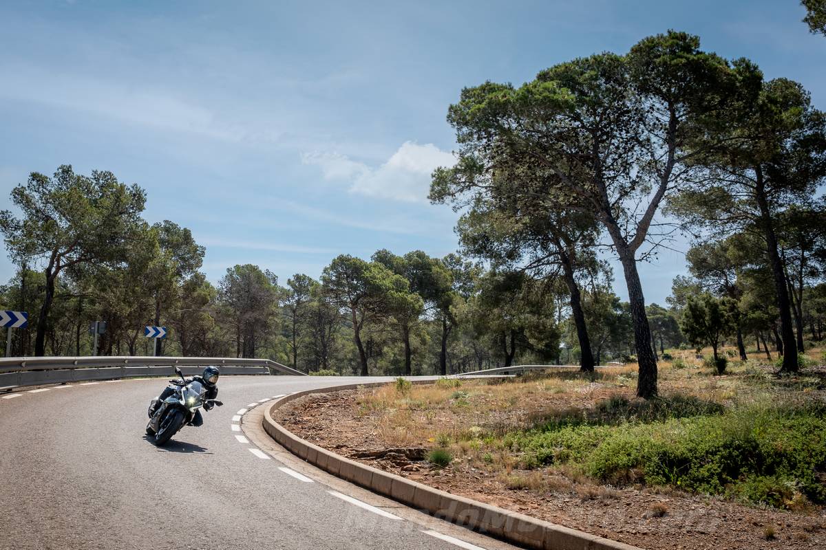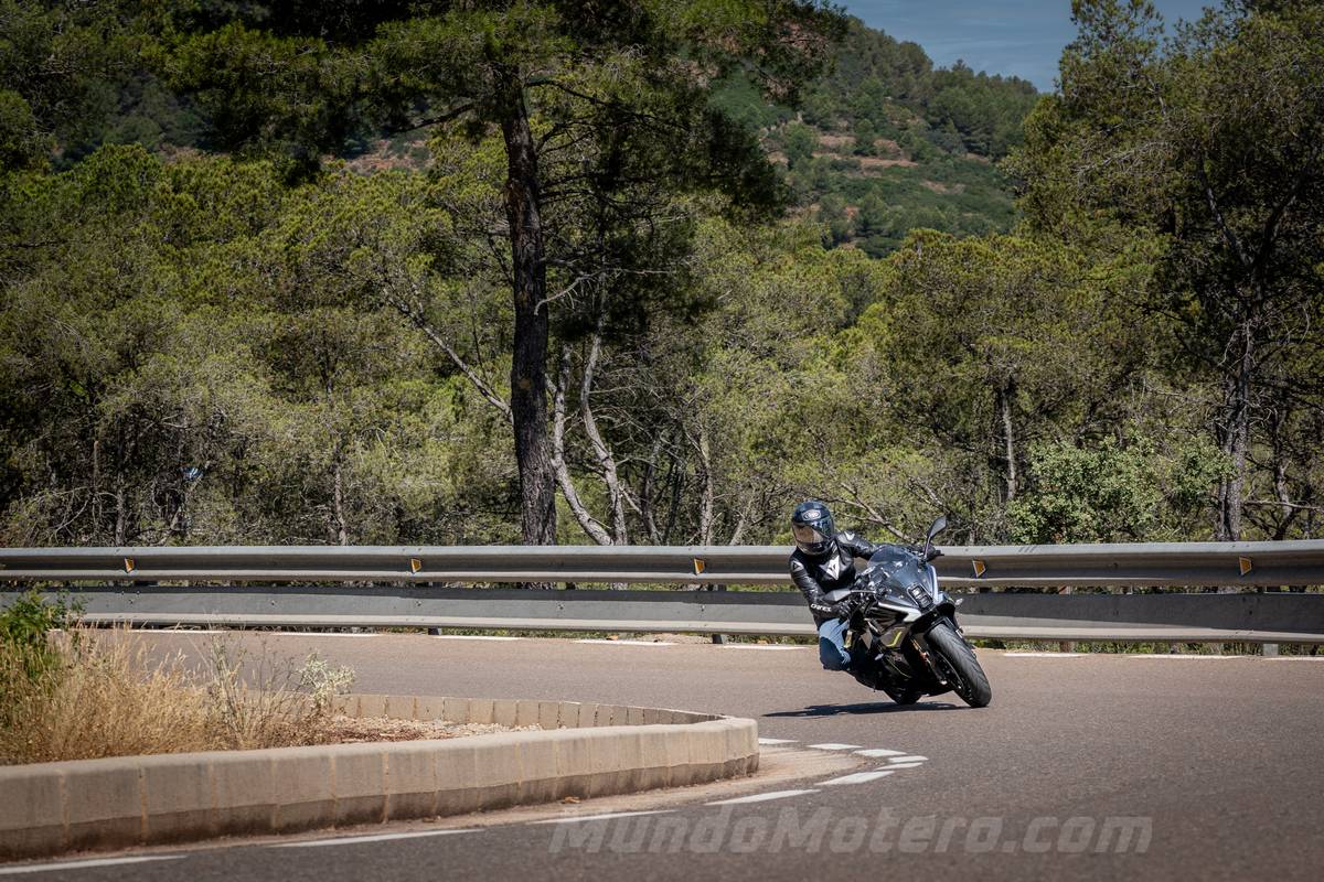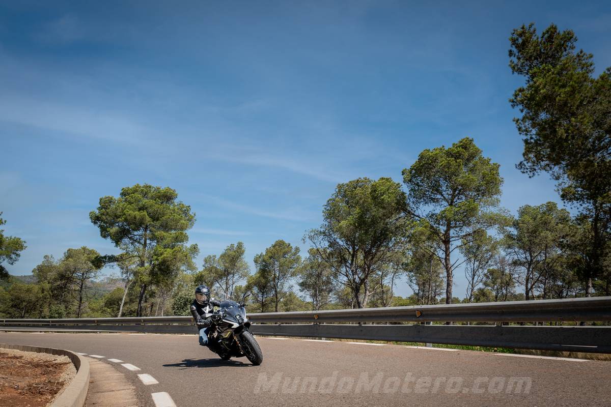 No hace falta llevar una gran velocidad, pero el paso por curva es muy estable, sobre todo porque tiene una parte ciclo que está completamente sobredimensionada para esta moto. Esta parte ciclo, compuesta por una horquilla invertida con barras de 41 mm, completamente regulable y firmada por Marzocchi, igual que el monoamortiguador trasero, trabaja a la perfección con esta potencia.