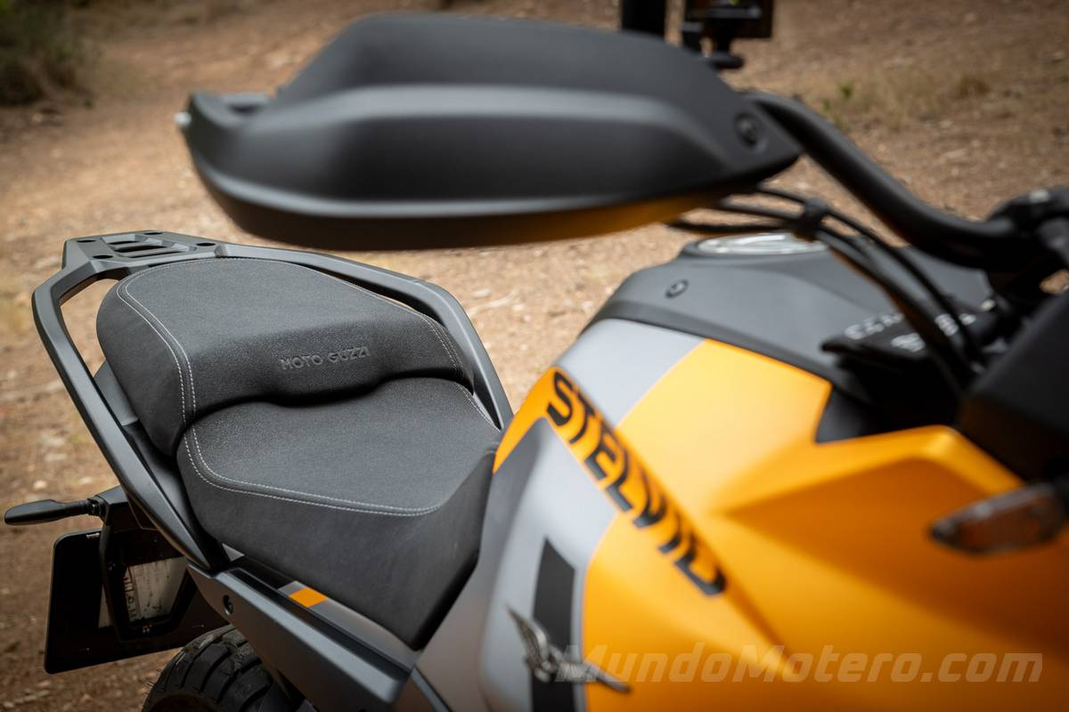 La Stelvio está pensada para hacer kilómetros, y se nota en la ergonomía. El manillar es amplio y está elevado gracias a torretas que favorecen una posición cómoda. El asiento, situado a 830 mm del suelo, me permitió llegar bien con ambas plantas de los pies (mido 1,70 m). Además, tiene un mullido excelente, y un pequeño respaldo que lo une con el asiento del acompañante.