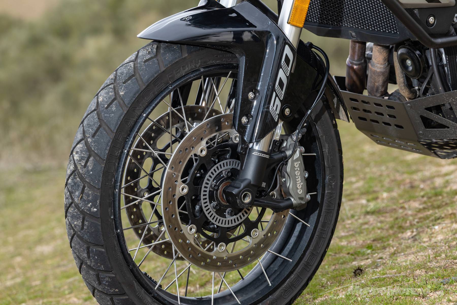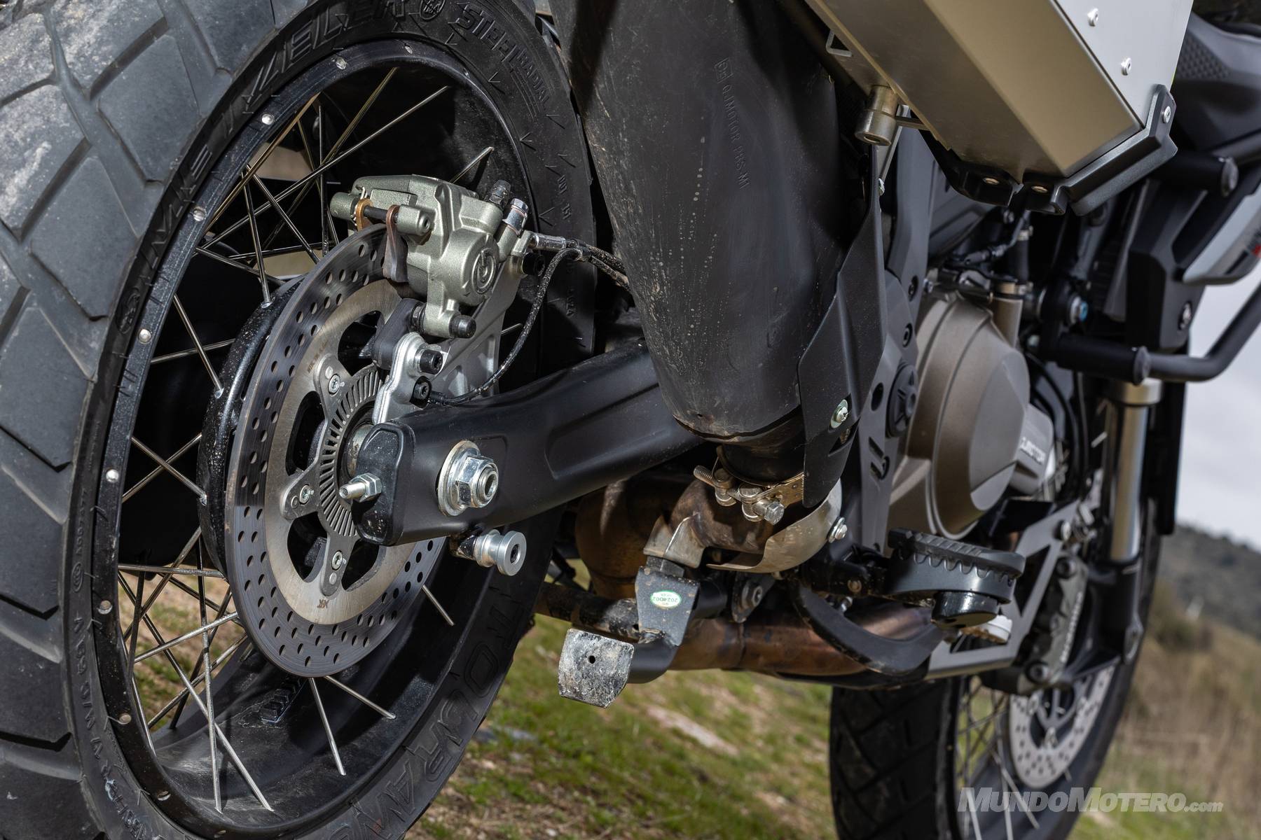 A simple vista, resaltan los radios de unas llantas que representan en sí mismas el signo de identidad off road más genuino. Sin embargo, a medida que damos un repaso al resto de la moto, vamos cambiando el rumbo de su orientación. En primer lugar, el tamaño de las propias llantas con sus 19 y 17 pulgadas respectivamente, a renglón seguido el recorrido de las suspensiones, con solo 140 mm tanto delante como detrás, y para rematar, la anchura del manillar, cumpliendo por la mínima el margen de una trail, con una medida que montan muchas motos naked.