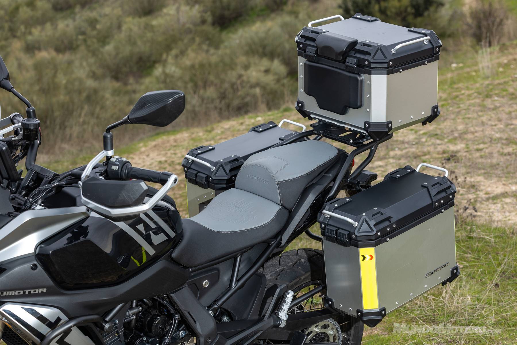 En el tren trasero, para no desentonar, un disco de 260 mm nos vendrá fenomenal para equilibrar el conjunto durante la retención, particularmente cuando vayamos acompañados y con las maletas al pleno de su llamativa capacidad. 30, 37 y 45 litros para el baúl, donde cabe un casco trail integral de talla grande.