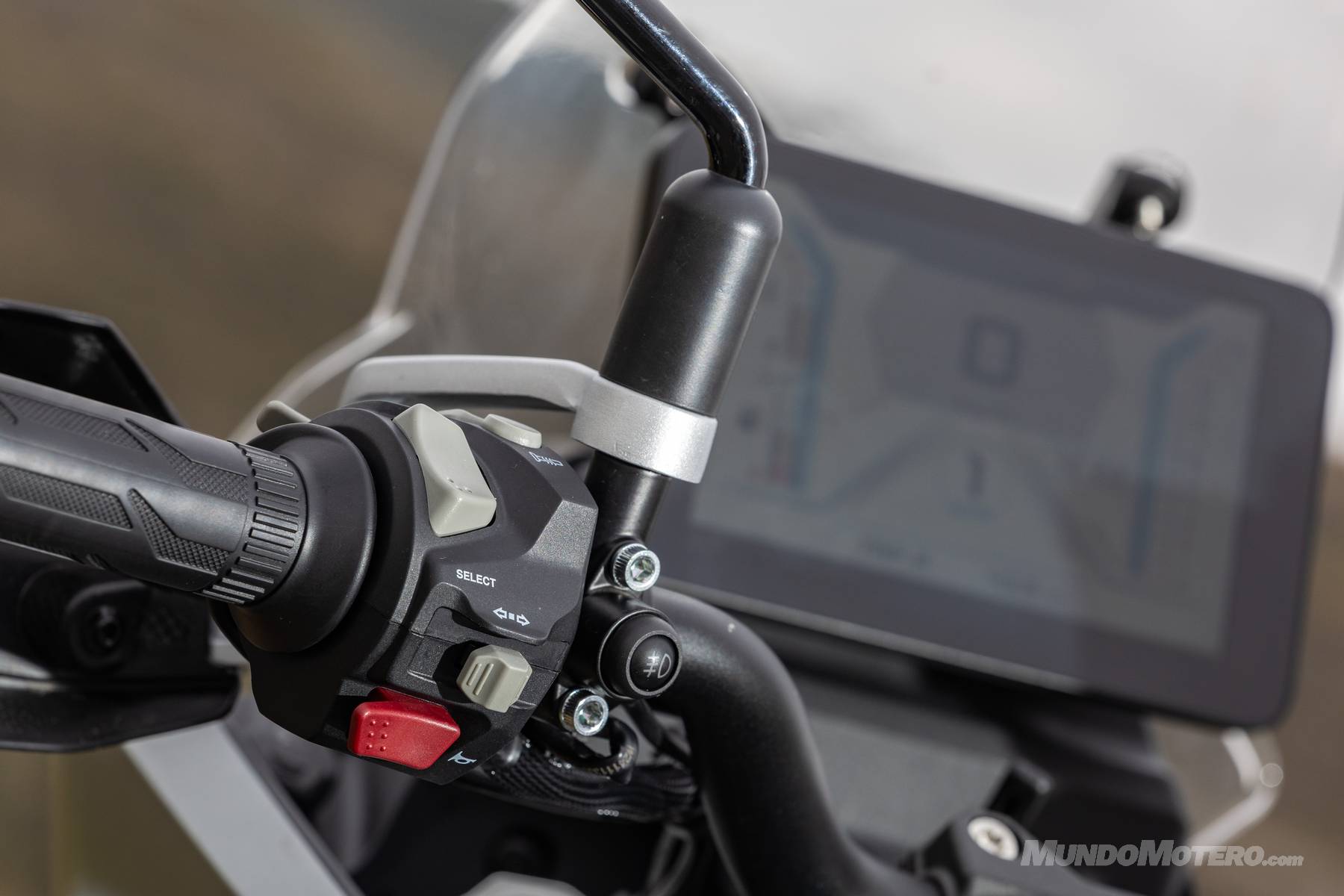 Al impacto óptico que encontramos con las maletas, se suman unos protectores para las manos dignos de venderse como extra para una moto de enduro, y además los faros antiniebla, los protectores laterales anti caída. A todo esto que se ve, podemos añadir los puños calefactados en 3 niveles ¡y el asiento también calefactado para ambas plazas!, que ya hemos mencionado. Llaman la atención los indicadores de dirección integrados en el filo de la carrocería, ofreciendo una imagen propia de una gran moto cuando se encienden.
