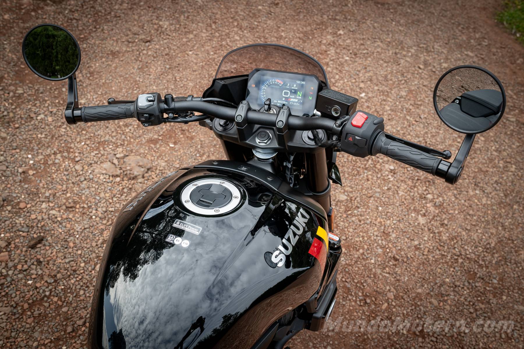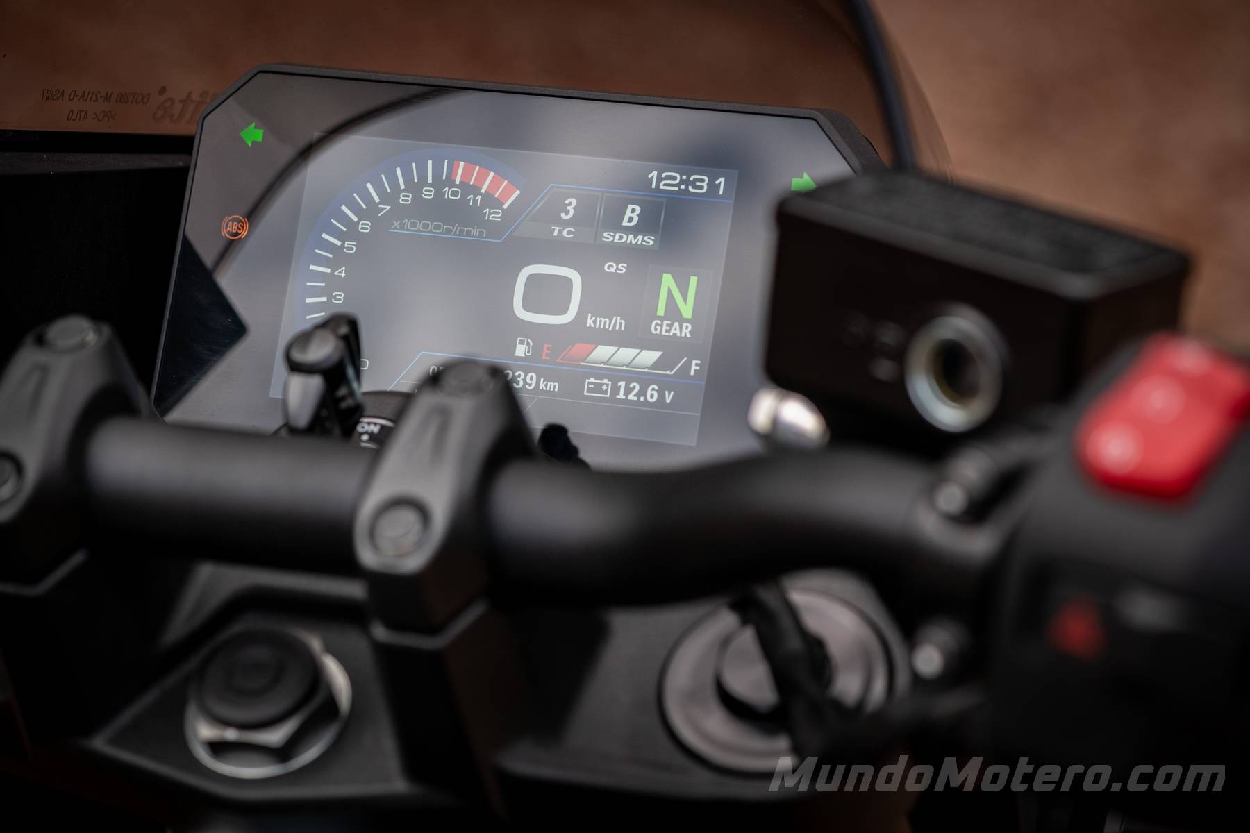 En el apartado tecnológico, llega bien equipada. Viene con una pantalla TFT de 5 pulgadas que se lee de maravilla, iluminación Full LED y todo el paquete electrónico de Suzuki: 3 modos de conducción (A, B y C) y control de tracción regulable y desconectable.