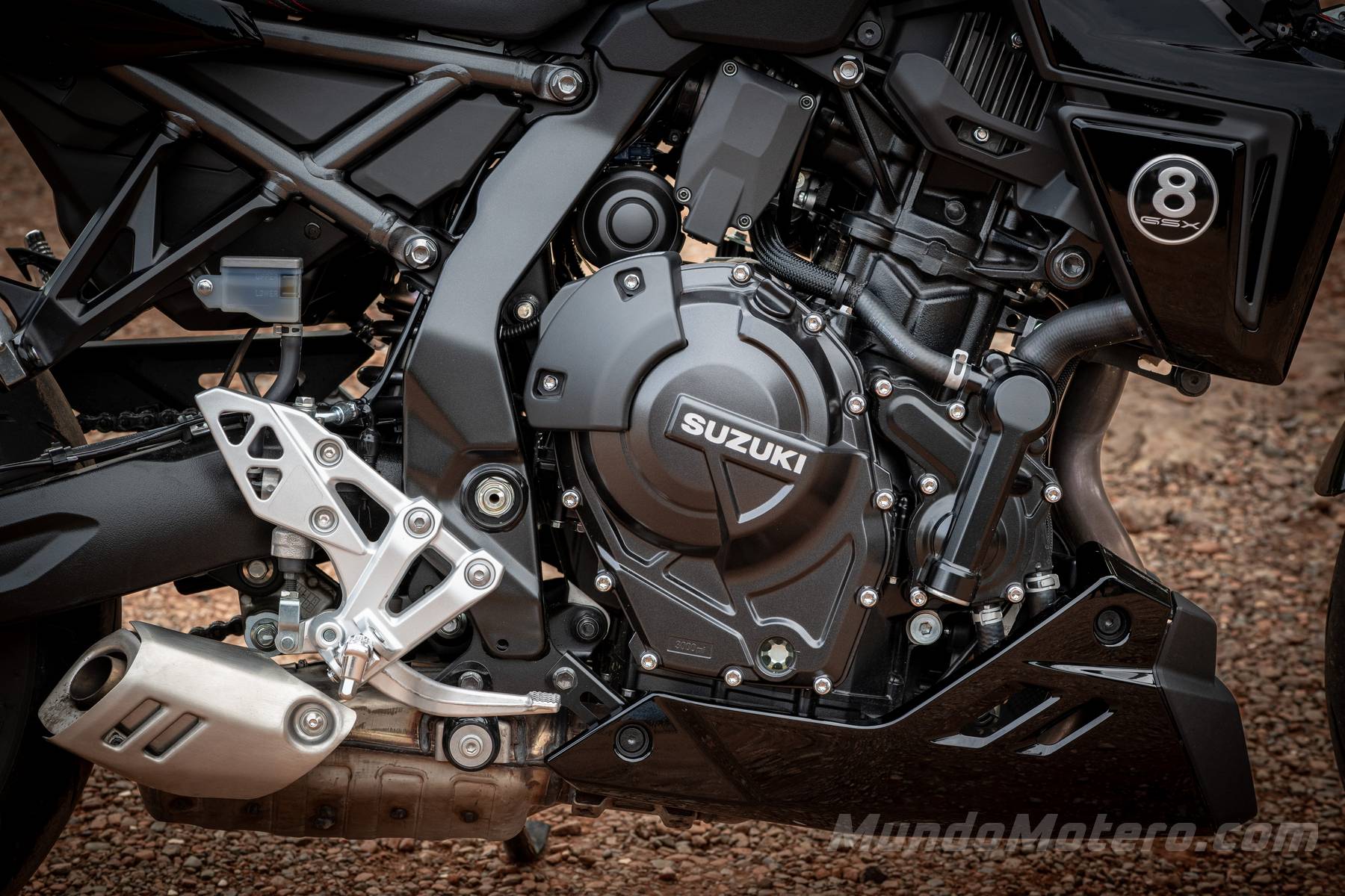 Hablemos de lo que la mueve. Monta el ya conocido motor bicilíndrico en paralelo de 776 cc con cigüeñal calado a 270 grados, que montan su hermana GSX-8S y que tan buenas sensaciones nos dejó durante su presentación nacional.